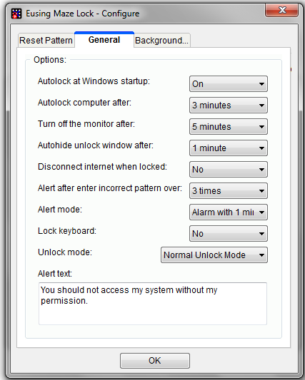 - After setting up a new pattern, click on General Tab. Here you have you set Maze lock settings like turning on Autolock at windows startup/after specified time, adding alert text…